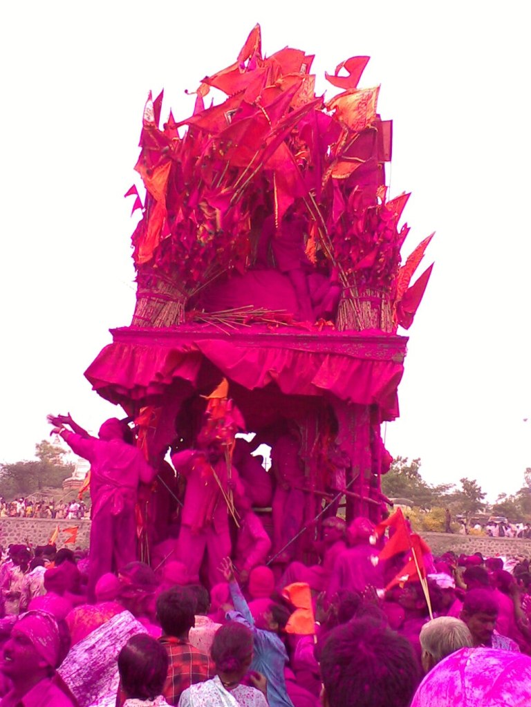 People milled around the streets with their families, covered in pink Gulaal (colour powder) from head to toe. Street hawkers had arrived overnight and were selling ice cream, peanuts, berries and guavas. Around early evening, we heard the sound of drums and excited chants, announcing the rath’s arrival. It looked like a ramshackle structure, but had immense wheels and a throne at its centre, where the Raja Rajmane of the royal family of Mhaswad would be seated. A special place at the centre was also occupied by the idol of Lord Siddhanath from the temple on his round.